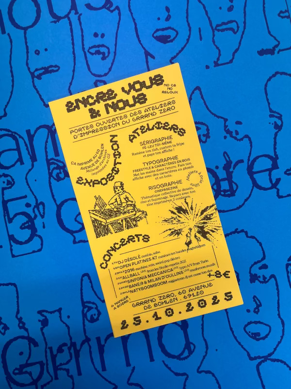 Avec l’atelier de typographie Peso Pluma, l’atelier Crayon, l’atelier de sérigraphie, l’atelier de risographie Tonertoner et le Brrrazero, nous organisons une grande journée portes ouvertes de l’impression « Encre vous et nous », le samedi 25 octobre 2025.