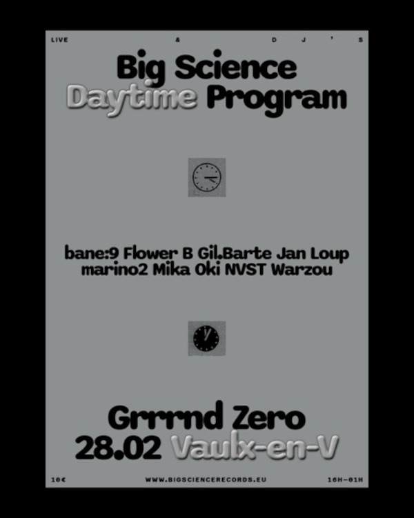 Le label lyonnais Big Science Records revient pour une journée complète autour de lives et DJ sets. Le programme rassemble bane:9, Gil.Barte et marino2 pour des performances live, tandis que Flower B, Mika Oki, NVST et Warzou assureront les DJ sets.